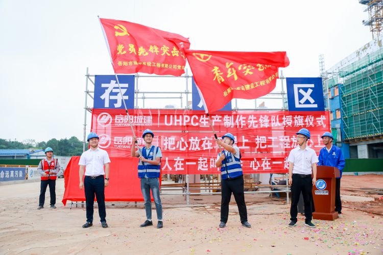 活動(dòng)中,岳陽城建主要領(lǐng)導(dǎo)分別給中心醫(yī)院項(xiàng)目部黨員、青年突擊隊(duì)(生產(chǎn)制作先鋒)進(jìn)行授旗,并為“UHPC屋架施工黨員示范區(qū)”揭牌。